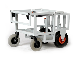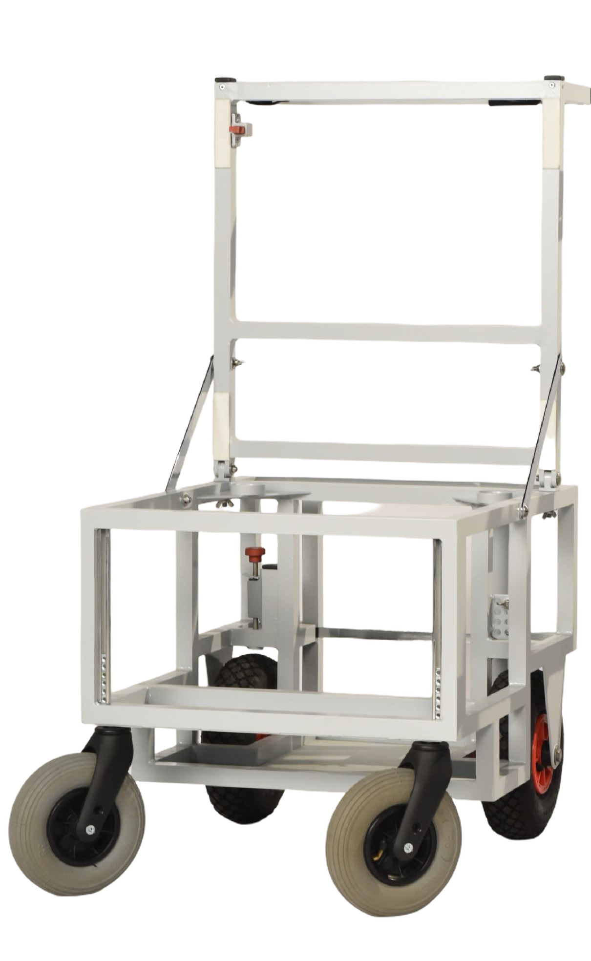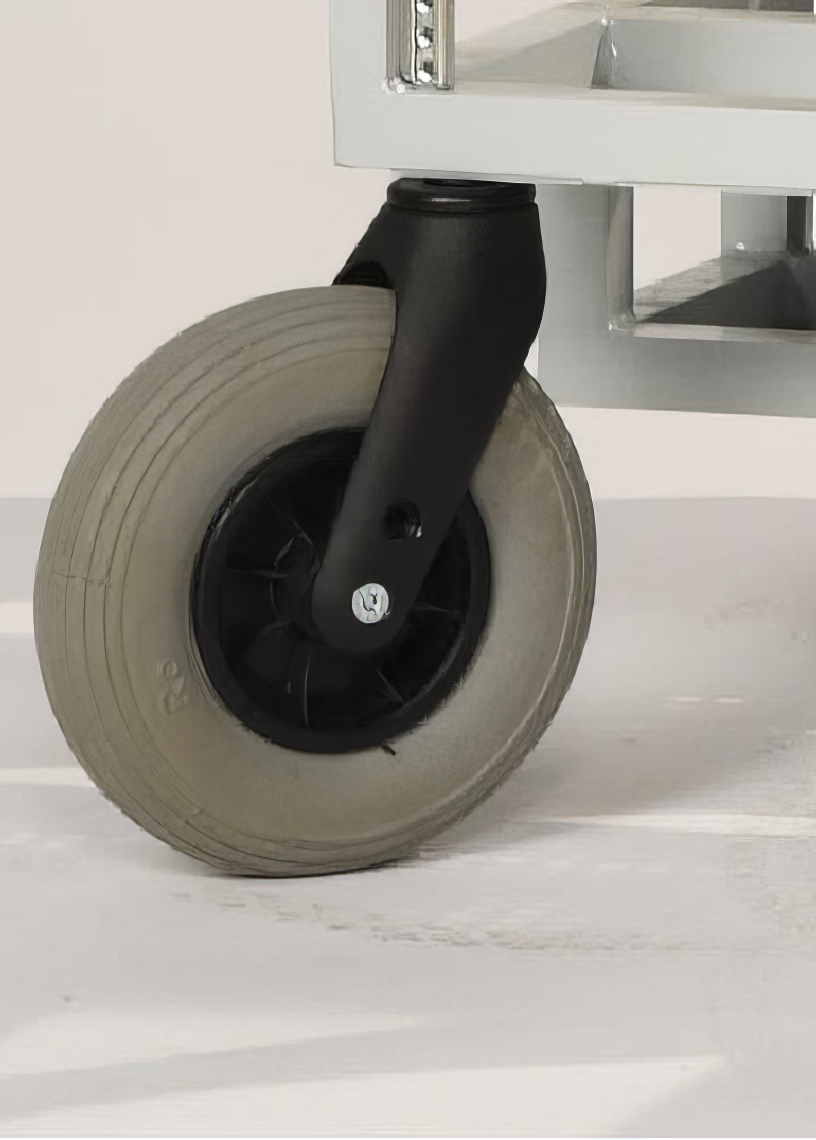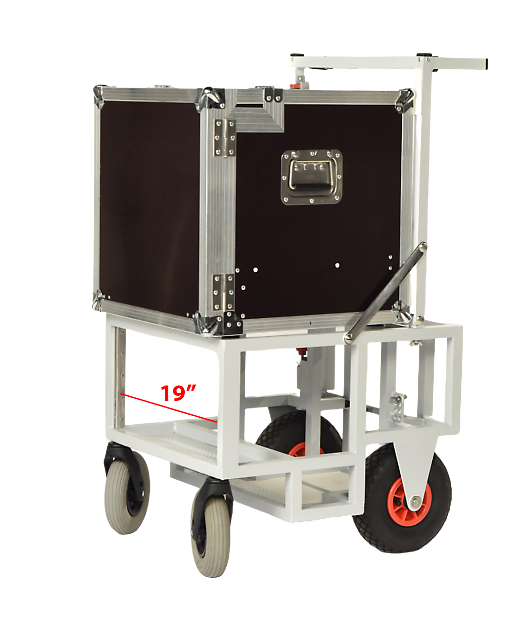 Sound Smart Cart is built from plasticized aluminum profiles and stainless steel components with front wheels Ø 200mm wheels with pneumatic tires. Standard size for rear wheels is Ø 260mm. Front, Ø 200 mm wheels provide better mobility on rough terrains and easier and faster moving on the set and more absorption of vibrations that can be carried onto equipment on the location sound cart.