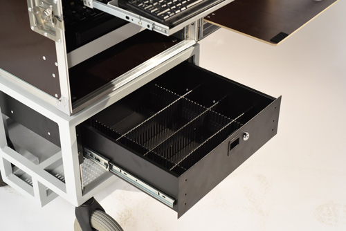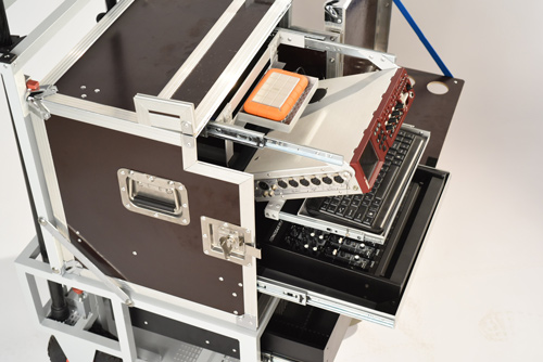Smart Sound Cart offers you to add 19″ drawer (ADAM HALL in picture) where you can store all small things you need on the set. Audio Box (Flight Case) is built in a 19″ rack standard from Aluminum and waterproof plywood with Protex Stainless Steel locks and hinges. It can be customized for different sound recorders and mixing consoles – control surfaces. Audio Box has a fully removable door. Also there is a shelf that can accommodate small or medium size keyboard. Optional keyboard shelf can be replaced with tablet holder. Under the mixing consoles – control surfaces, the shelf is 19” 2U space ready to accommodate drawer or anything else that is 19” 1U or 2U size. 19” WIRELESS 2U AND 4U MONITOR 6U L&R RACK MOUNT STYLE ADDON Additional place on top of the trolley handle to accommodate wireless receivers and monitors up to and including 8” W=19” x H=6U x D=220mm (8.66″)